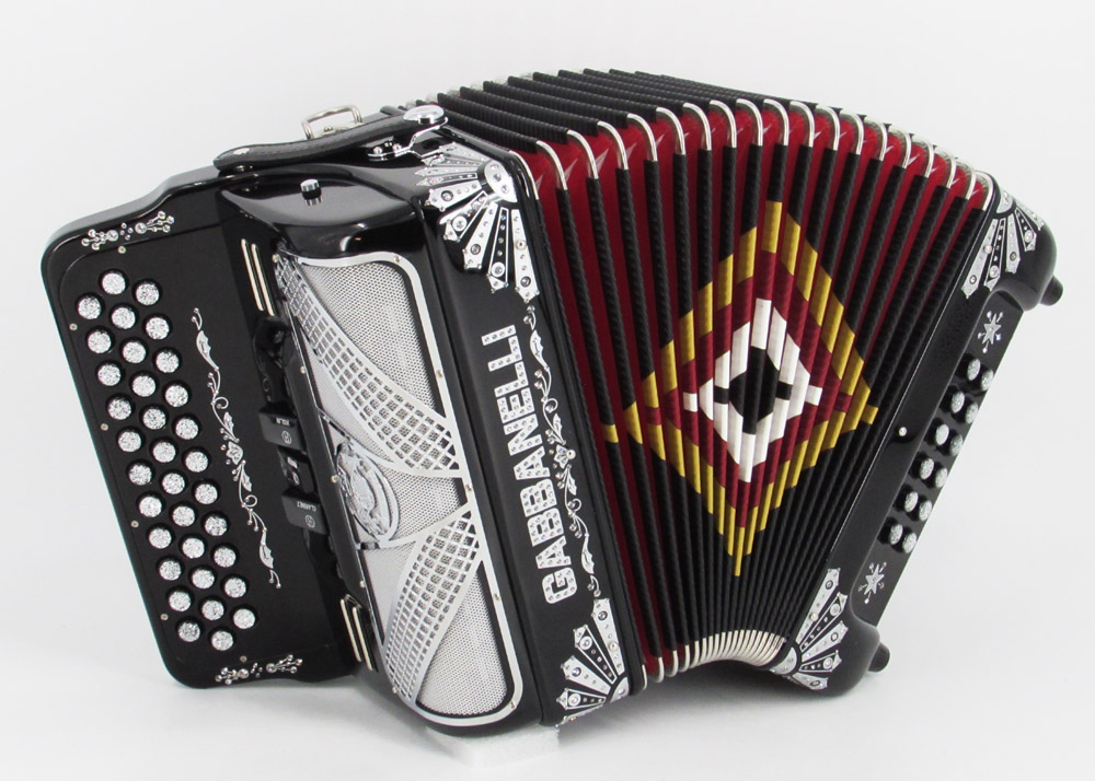 Acordeón Gabbanelli compacto y ligero de 3 registros y 34 Botones. Altamente preferido por su sonido poderoso, natural entonación y bajo peso en un diseño estilizado. Ensamblado a mano en Italia, con los materiales de la más alta calidad. Gabbanelli Modelo Compacto 103- 34 Botones – 3 registros de sonido. Disponible también con voces de bajos, mediante pedido especial. Incluye estuche, correas y garantía.