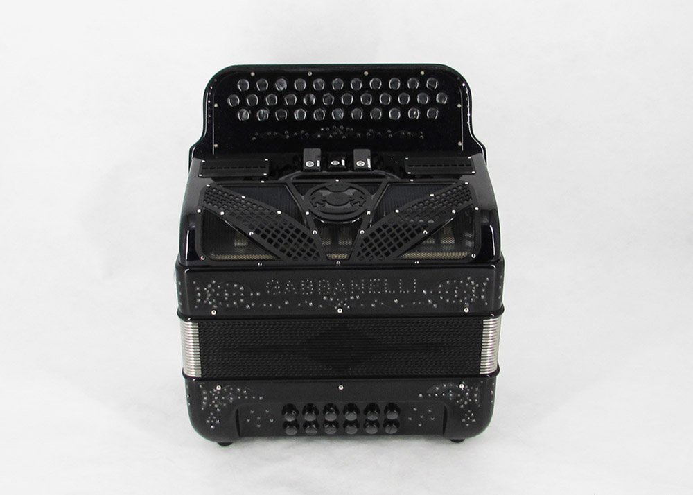 Acordeón Gabbanelli compacto y ligero de 3 registros y 34 Botones. Altamente preferido por su sonido poderoso, natural entonación y bajo peso en un diseño estilizado. Ensamblado a mano en Italia, con los materiales de la más alta calidad. Gabbanelli Modelo Compacto 103- 34 Botones – 3 registros de sonido. Disponible por un costo adicional. Incluye estuche, correas y garantía.