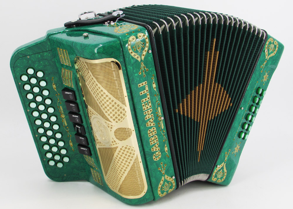 Con un diseño nunca antes visto de Acordeones Gabbanelli, nuestro acordeón 2tonos de tamaño compacto es más pequeño y ligero que nuestro modelo 2tonos regular de tamaño clásico. Este acordeón es uno de los favoritos por su versatilidad al cambiar de tonos con el sólo toque de un registro y porque está hecho a mano con la más alta calidad de materiales y ensamblado por expertos artesanos. Modelo 2 Tonos Tamaño Compacto- 34 Botones -dos tonos en uno, 3 registros de sonido cada tono. Incluye estuche, correas y garantía.