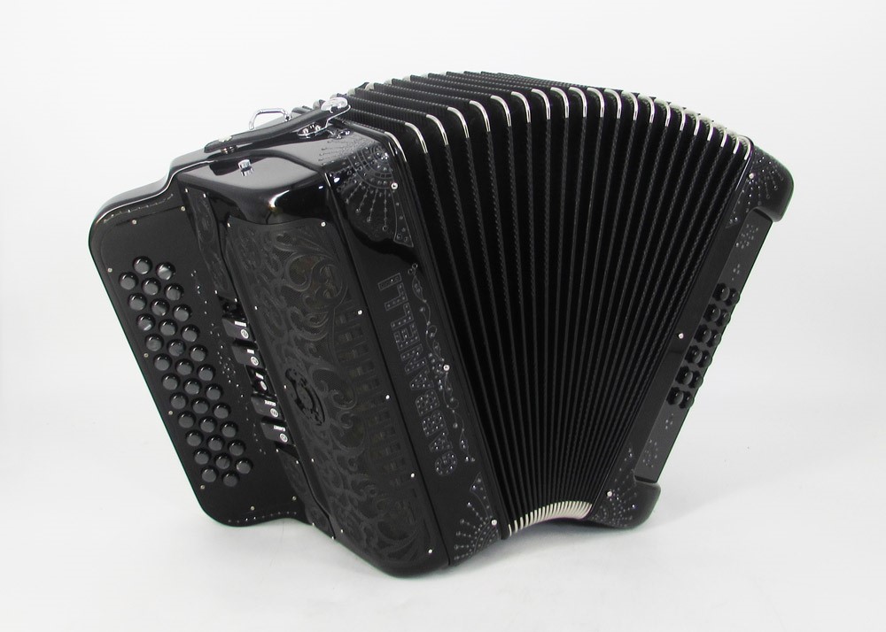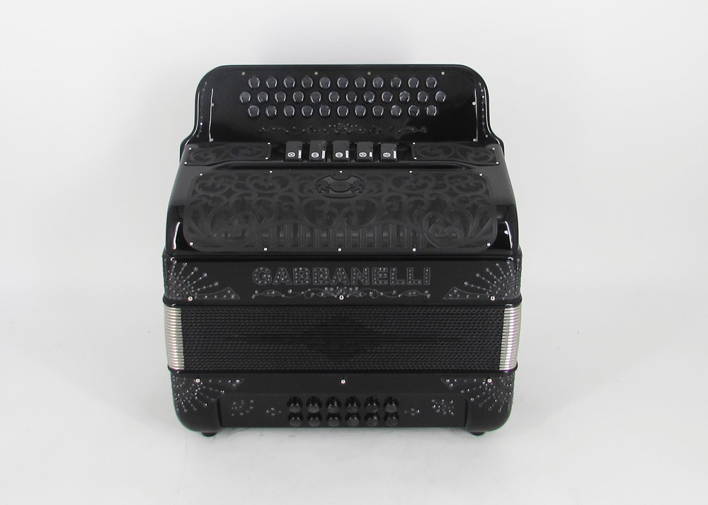 El distintivo acordeón Gabbanelli tamaño grande original de 5 registros. Produce un sonido profundo que sólo puede lograrse gracias a que es elaborado a mano, con los más elevados estándares de materiales y ensamblado con voces de la mejor calidad. Los acordeones Gabbanelli que tenemos actualmente en nuestro catálogo son los instrumentos más refinados en el mercado y son el resultado de nuestro gran conocimiento y colaboración continua desde 1961 con los mejores acordeonistas. Esta obra maestra es producto del desarrollo de Acordeones Gabbanelli a lo largo de varias décadas y de un trabajo artesanal hecho por expertos italianos que han sido seleccionados para cumplir nuestros parámetros de excelencia. El Modelo 400- 34 Botones – 5 registros incluye estuche, correas y garantía. Los bajos están disponibles bajo pedido especial y por un costo adicional.