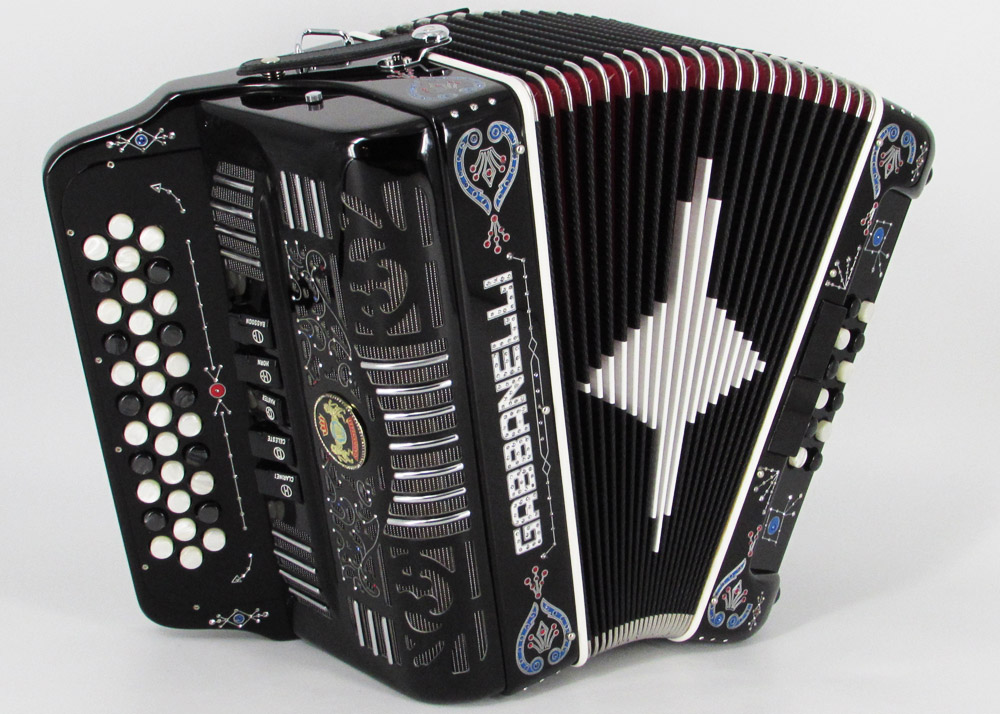 El distintivo acordeón Gabbanelli tamaño grande original de 5 registros. Produce un sonido profundo que sólo puede lograrse gracias a que es elaborado a mano, con los más elevados estándares de materiales y ensamblado con voces de la mejor calidad. Los acordeones Gabbanelli que tenemos actualmente en nuestro catálogo son los instrumentos más refinados en el mercado y son el resultado de nuestro gran conocimiento y colaboración continua desde 1961 con los mejores acordeonistas. Esta obra maestra es producto del desarrollo de Acordeones Gabbanelli a lo largo de varias décadas y de un trabajo artesanal hecho por expertos italianos que han sido seleccionados para cumplir nuestros parámetros de excelencia. El Modelo 400- 34 Botones – 5 registros incluye estuche, correas y garantía. Los bajos están disponibles bajo pedido especial y por un costo adicional.