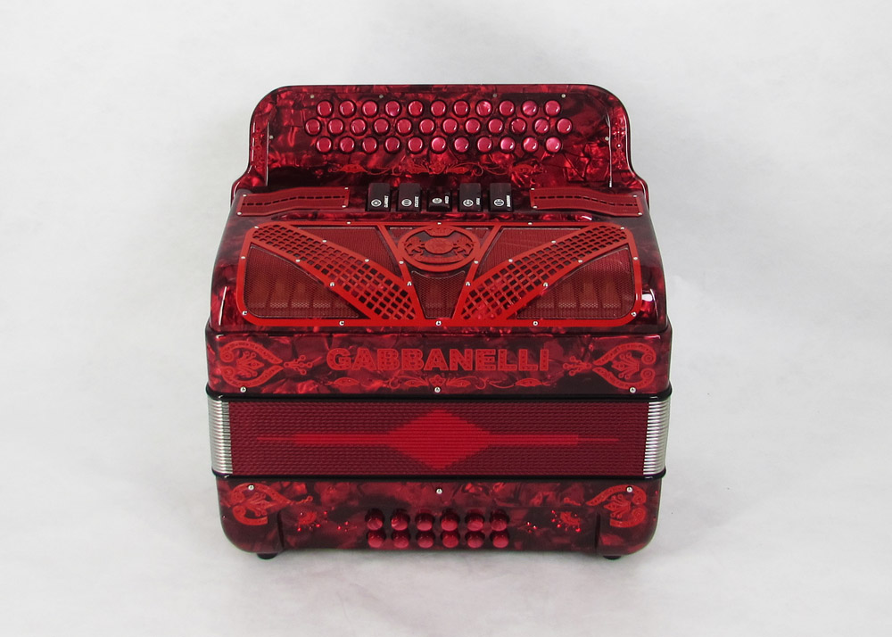 El distintivo acordeón Gabbanelli tamaño grande original de 5 registros. Produce un sonido profundo que sólo puede lograrse gracias a que es elaborado a mano, con los más elevados estándares de materiales y ensamblado con voces de la mejor calidad. Los acordeones Gabbanelli que tenemos actualmente en nuestro catálogo son los instrumentos más refinados en el mercado y son el resultado de nuestro gran conocimiento y colaboración continua desde 1961 con los mejores acordeonistas. Esta obra maestra es producto del desarrollo de Acordeones Gabbanelli a lo largo de varias décadas y de un trabajo artesanal hecho por expertos italianos que han sido seleccionados para cumplir nuestros parámetros de excelencia. El Modelo 400- 34 Botones – 5 registros incluye estuche, correas y garantía. Los bajos están disponibles bajo pedido especial y por un costo adicional.