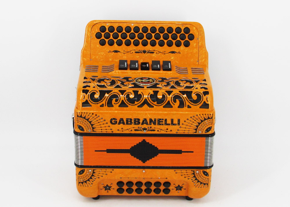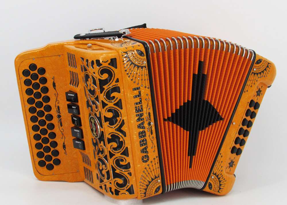 El distintivo acordeón Gabbanelli tamaño super compacto de 5 registros. Produce un sonido profundo que sólo puede lograrse gracias a que es elaborado a mano, con los más elevados estándares de materiales y ensamblado con voces de la mejor calidad. Los acordeones Gabbanelli que tenemos actualmente en nuestro catálogo son los instrumentos más refinados en el mercado y son el resultado de nuestro gran conocimiento y colaboración continua desde 1961 con los mejores acordeonistas. Esta obra maestra es producto del desarrollo de Acordeones Gabbanelli a lo largo de varias décadas y de un trabajo artesanal hecho por expertos italianos que han sido seleccionados para cumplir nuestros parámetros de excelencia. El Modelo 400- 34 Botones – 5 registros incluye estuche, correas y garantía. Los bajos están disponibles bajo pedido especial y por un costo adicional.