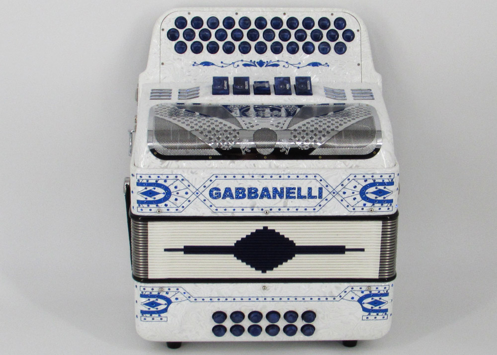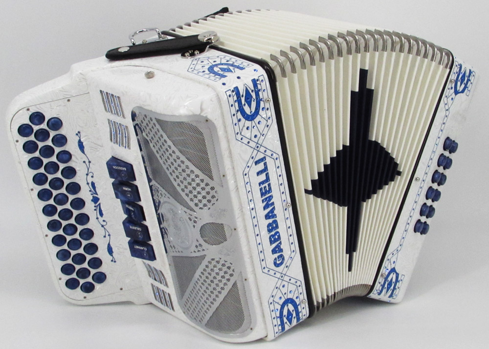 El distintivo acordeón Gabbanelli tamaño super compacto de 5 registros. Produce un sonido profundo que sólo puede lograrse gracias a que es elaborado a mano, con los más elevados estándares de materiales y ensamblado con voces de la mejor calidad. Los acordeones Gabbanelli que tenemos actualmente en nuestro catálogo son los instrumentos más refinados en el mercado y son el resultado de nuestro gran conocimiento y colaboración continua desde 1961 con los mejores acordeonistas. Esta obra maestra es producto del desarrollo de Acordeones Gabbanelli a lo largo de varias décadas y de un trabajo artesanal hecho por expertos italianos que han sido seleccionados para cumplir nuestros parámetros de excelencia. El Modelo 400- 34 Botones – 5 registros incluye estuche, correas y garantía. Los bajos están disponibles bajo pedido especial y por un costo adicional.
