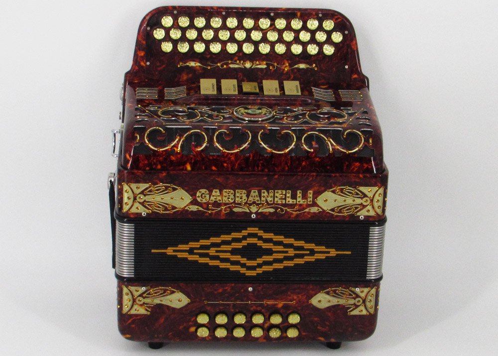 El distintivo acordeón Gabbanelli tamaño super compacto de 5 registros. Produce un sonido profundo que sólo puede lograrse gracias a que es elaborado a mano, con los más elevados estándares de materiales y ensamblado con voces de la mejor calidad. Los acordeones Gabbanelli que tenemos actualmente en nuestro catálogo son los instrumentos más refinados en el mercado y son el resultado de nuestro gran conocimiento y colaboración continua desde 1961 con los mejores acordeonistas. Esta obra maestra es producto del desarrollo de Acordeones Gabbanelli a lo largo de varias décadas y de un trabajo artesanal hecho por expertos italianos que han sido seleccionados para cumplir nuestros parámetros de excelencia. El Modelo 400- 34 Botones – 5 registros incluye estuche, correas y garantía. Los bajos están disponibles bajo pedido especial y por un costo adicional.