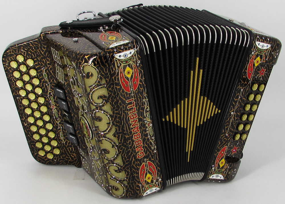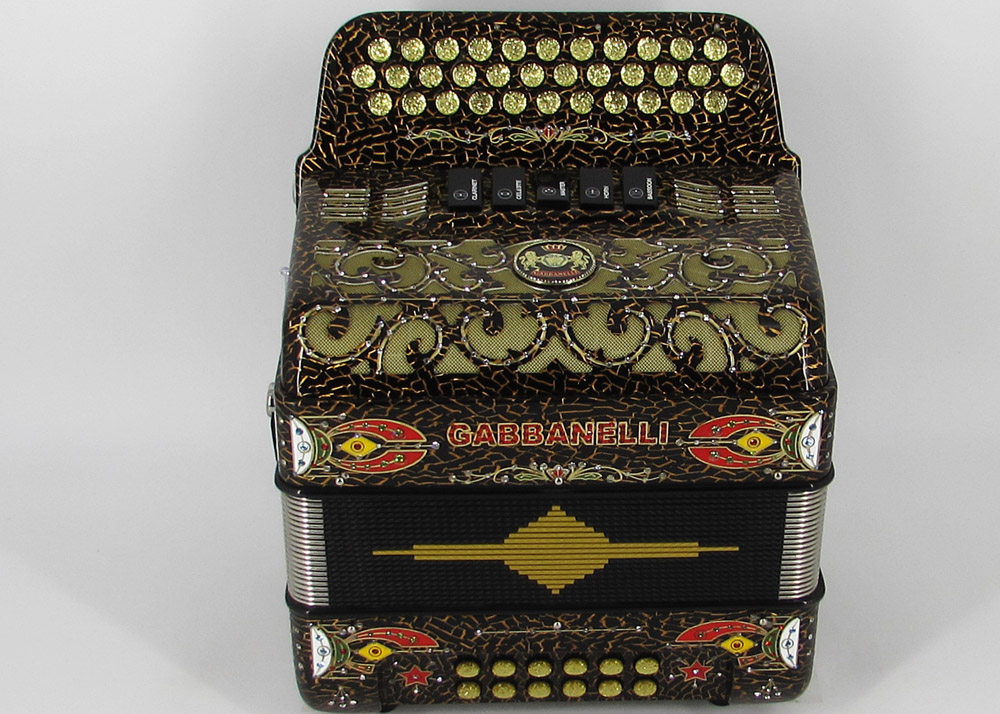 El distintivo acordeón Gabbanelli tamaño super compacto de 5 registros. Produce un sonido profundo que sólo puede lograrse gracias a que es elaborado a mano, con los más elevados estándares de materiales y ensamblado con voces de la mejor calidad. Los acordeones Gabbanelli que tenemos actualmente en nuestro catálogo son los instrumentos más refinados en el mercado y son el resultado de nuestro gran conocimiento y colaboración continua desde 1961 con los mejores acordeonistas. Esta obra maestra es producto del desarrollo de Acordeones Gabbanelli a lo largo de varias décadas y de un trabajo artesanal hecho por expertos italianos que han sido seleccionados para cumplir nuestros parámetros de excelencia. El Modelo 400- 34 Botones – 5 registros incluye estuche, correas y garantía. Los bajos están disponibles bajo pedido especial y por un costo adicional.