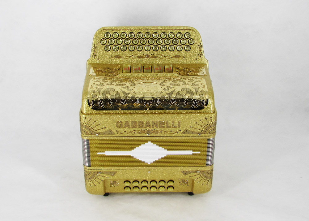 El distintivo acordeón Gabbanelli tamaño super compacto de 5 registros. Produce un sonido profundo que sólo puede lograrse gracias a que es elaborado a mano, con los más elevados estándares de materiales y ensamblado con voces de la mejor calidad. Los acordeones Gabbanelli que tenemos actualmente en nuestro catálogo son los instrumentos más refinados en el mercado y son el resultado de nuestro gran conocimiento y colaboración continua desde 1961 con los mejores acordeonistas. Esta obra maestra es producto del desarrollo de Acordeones Gabbanelli a lo largo de varias décadas y de un trabajo artesanal hecho por expertos italianos que han sido seleccionados para cumplir nuestros parámetros de excelencia. El Modelo 400- 34 Botones – 5 registros incluye estuche, correas y garantía. Los bajos están disponibles bajo pedido especial y por un costo adicional.